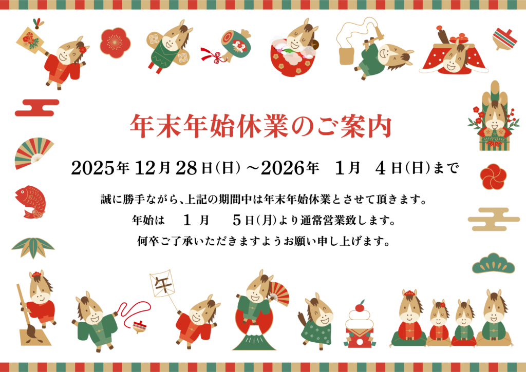 平素は格別のご高配を賜り、誠にありがとうございます。 年末年始の休業期間について、以下お知らせ致しま